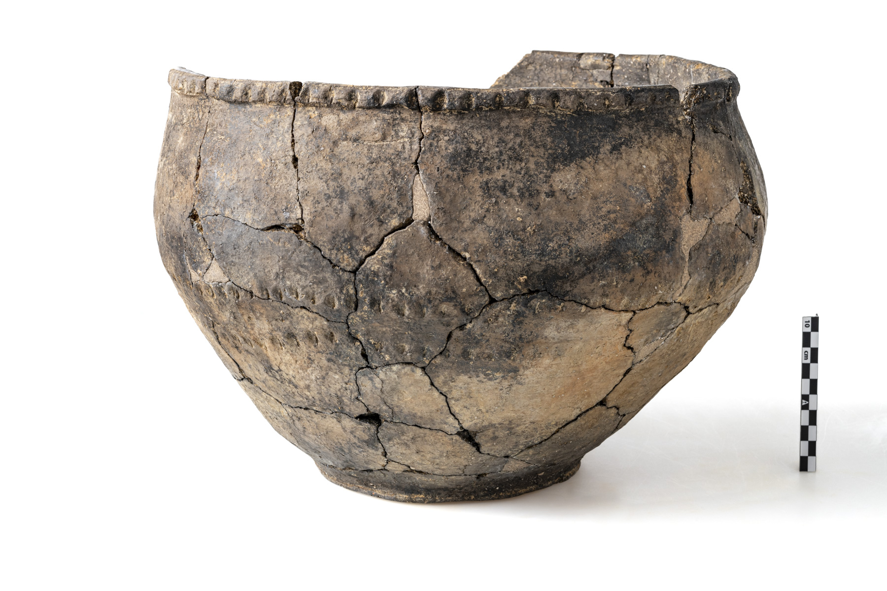 L’établissement romain tardif de Baelen-Nereth (330-430 AD) a livré plusieurs poteries façonnées selon des techniques et avec des argiles étrangères à l’artisanat céramique de cette époque en Gaule. Ce grand pot monté à la main est décoré d’impressions au doigt sur la lèvre et à mi-hauteur de la panse. C’est le seul exemplaire au profil complet de la culture archéologique « Rhin-Weser » connu en Belgique.